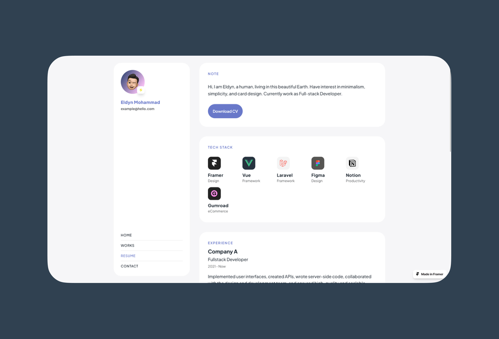 Dashby is a personal portfolio made for Framer. The template is 100% responsive and fully customizable, also it's support light and dark mode. You don't have to code anything! Just create Framer account and then whoosh, it's yours! You can edit the layout or content inside visually & publish your website.